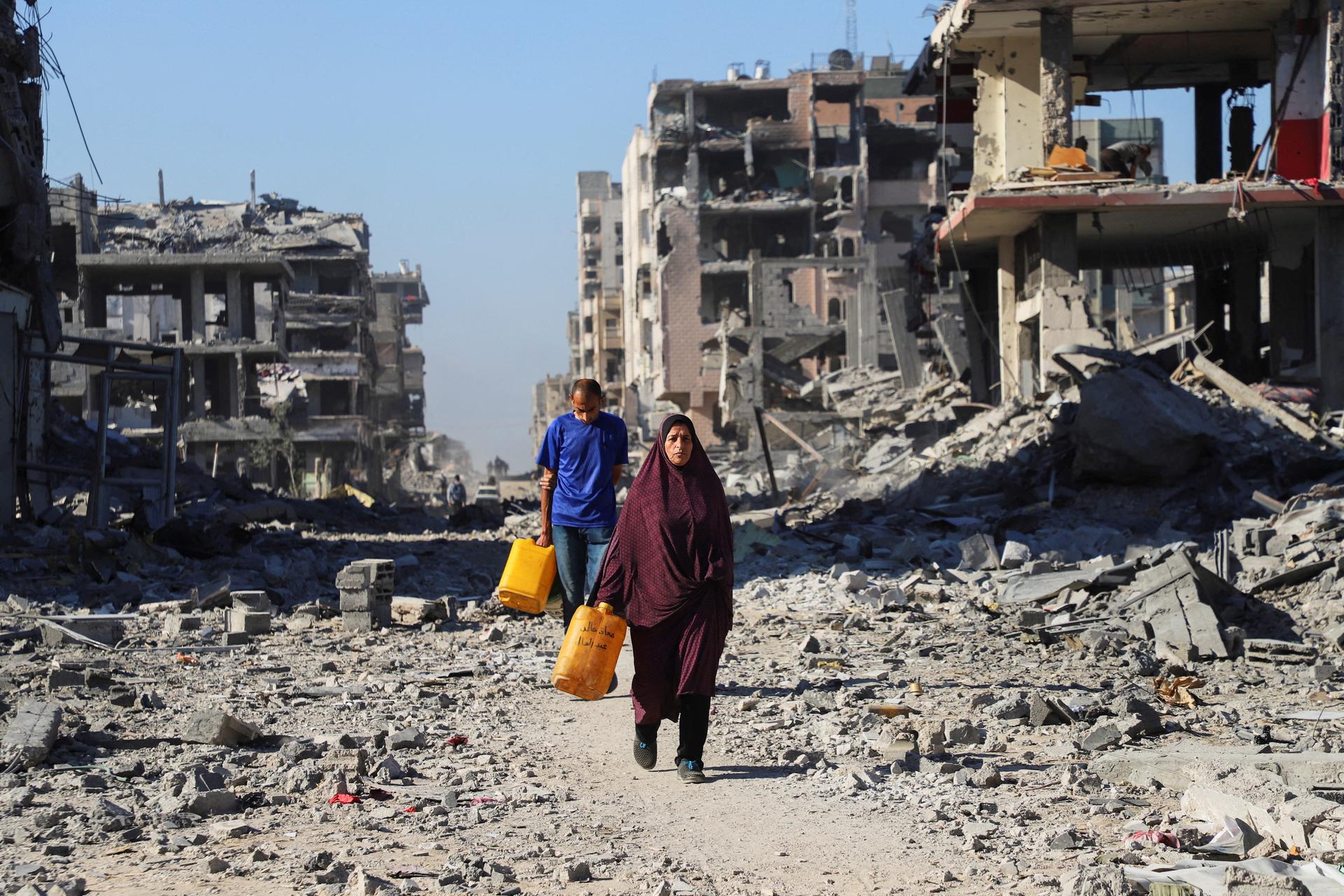 Palestinians walk past the rubble of destroyed buildings in Gaza City. REUTERS/Ebrahim Hajjaj |